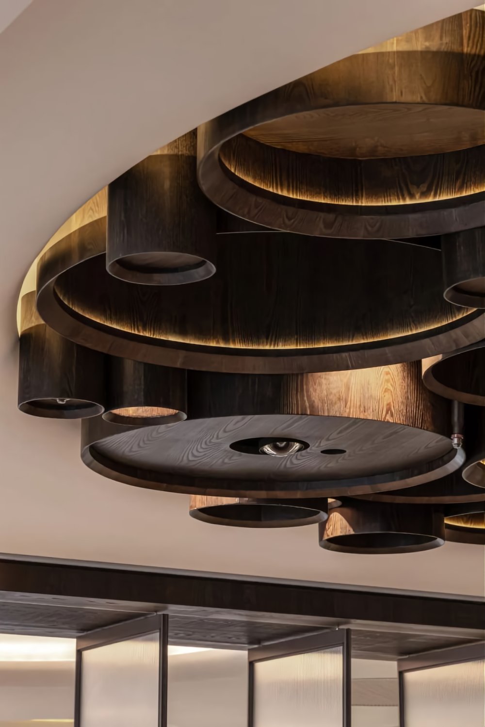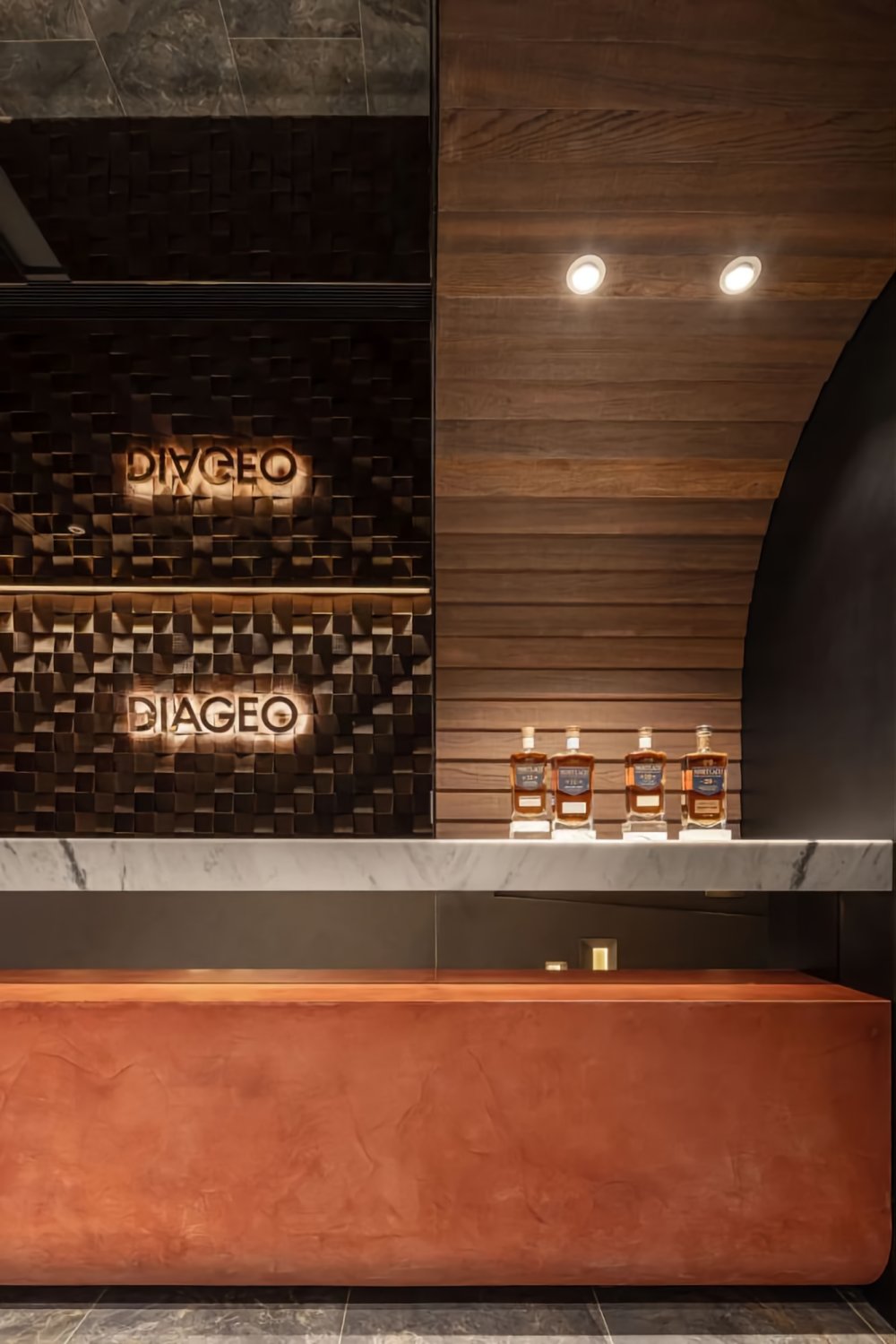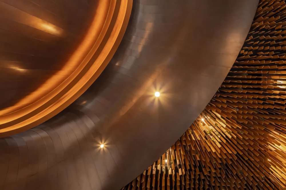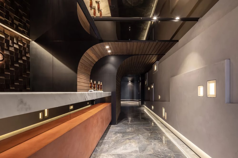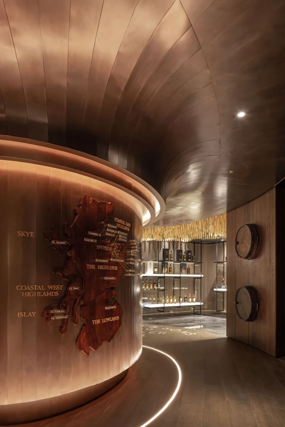 弧形雨淋板的層層堆疊,鏡面玻璃的點綴,簡馭繁的特殊涂料,空間以酒窖洞穴般圍塑洞中幻景作為開端,將大不列顛的蒸餾技術(shù)轉(zhuǎn)化為空間意象,開啟氣味與感知的文化之旅