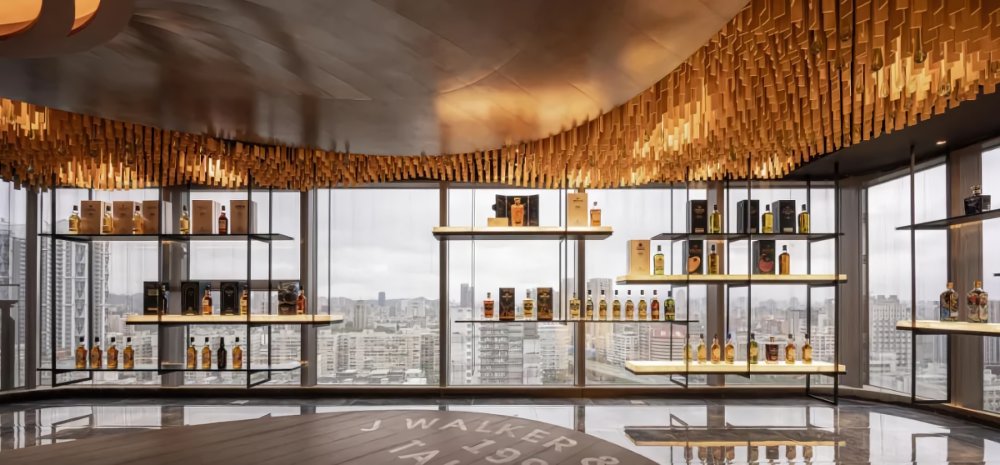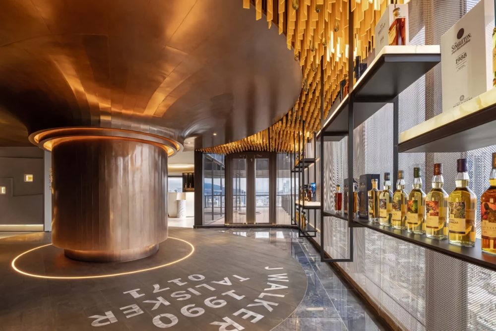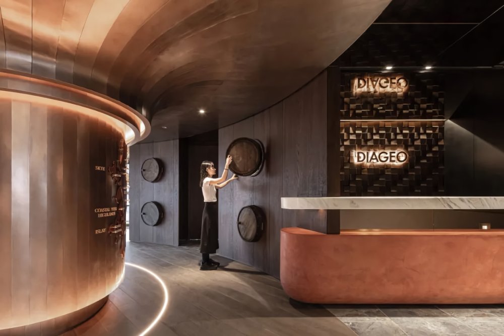 銅片堆砌成蒸餾壺、酒瓶回收再制打造谷物豐收的玻璃大麥意象,地面弧形的木板,鑲嵌如橡木桶的釀造文字,谷物的生長收割-蒸餾壺的蒸餾-注入橡木桶的陳釀,透過設(shè)計重新演繹,轉(zhuǎn)化形體、設(shè)計語匯,呈現(xiàn)於空間,將空間情感延伸品牌空間