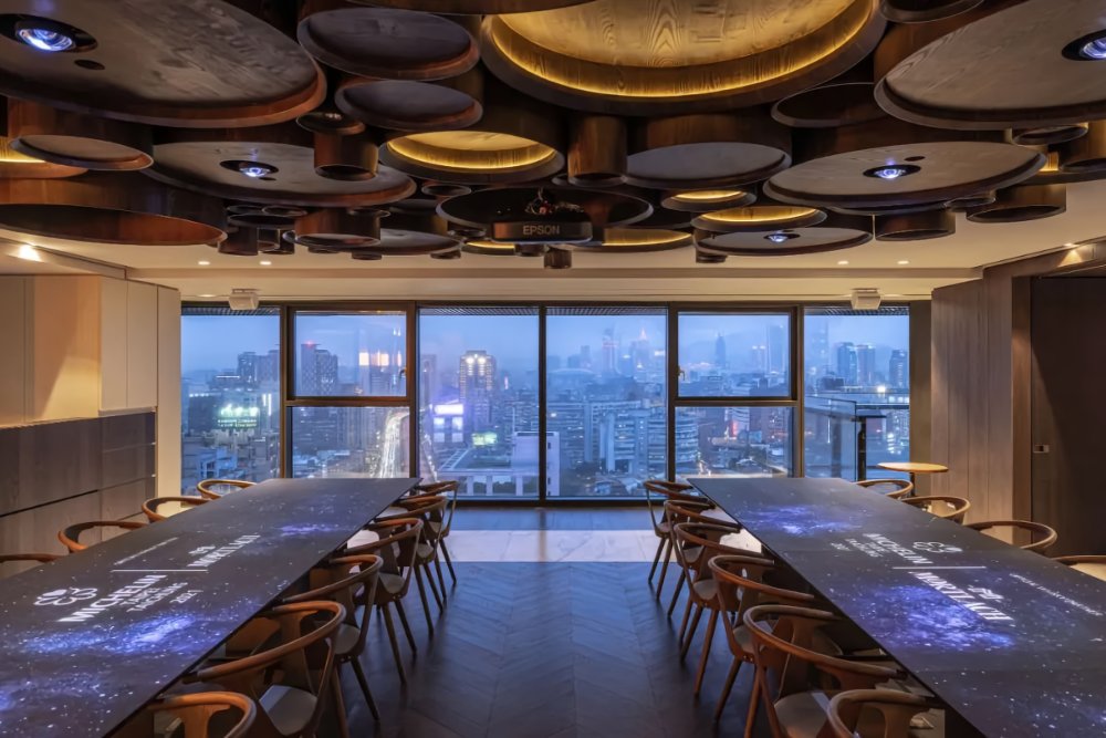 少了周遭建筑物的遮蔽,讓窗外視野更為單純美好,珍藏酒品的展示背景、與市景并存盡收眼底,穿梭當代與古代之間,感受空間與景致交織而成的感動