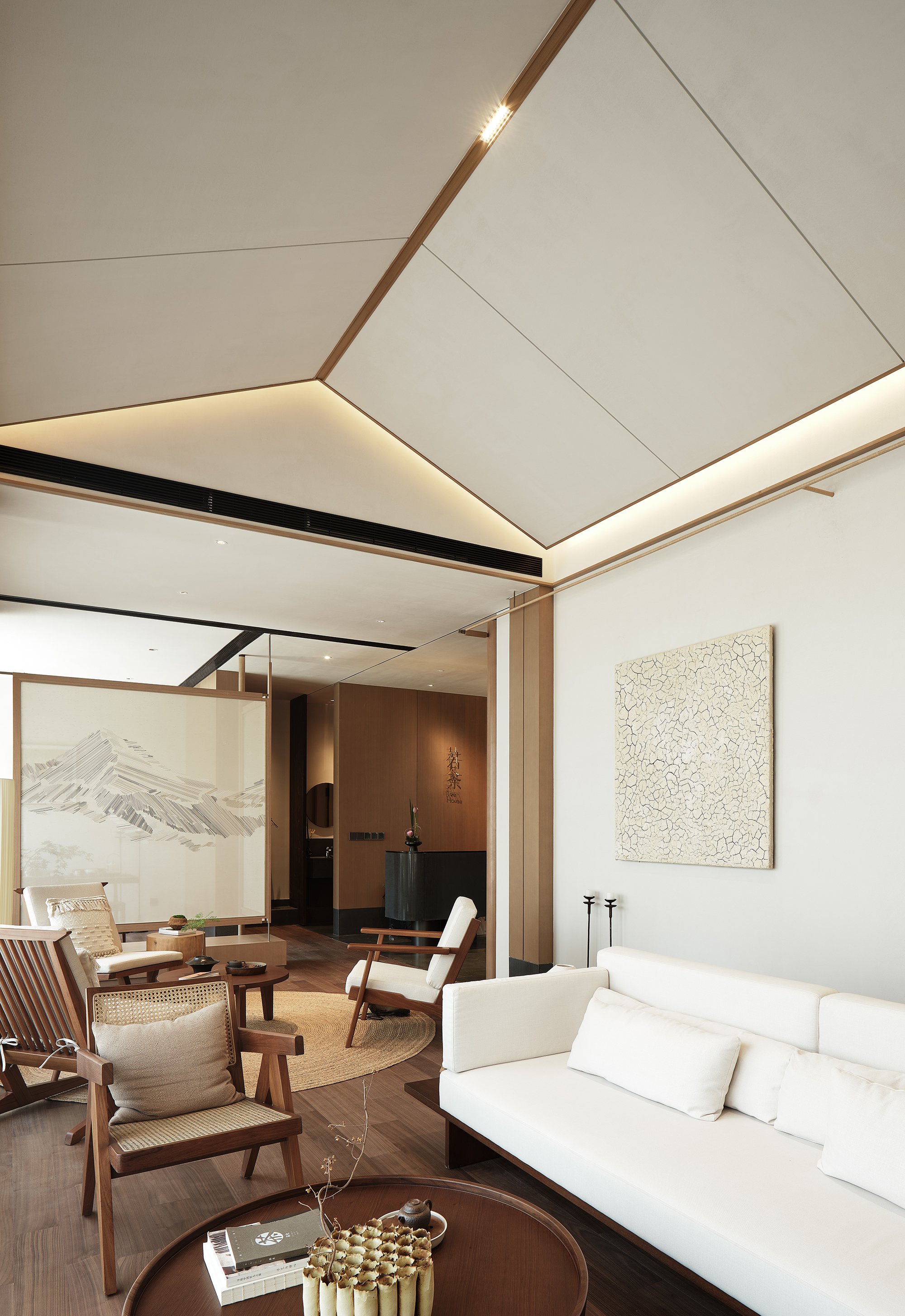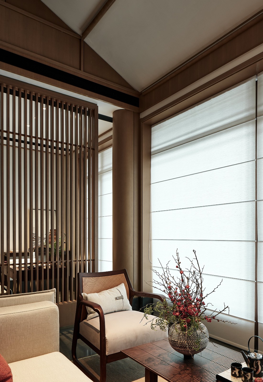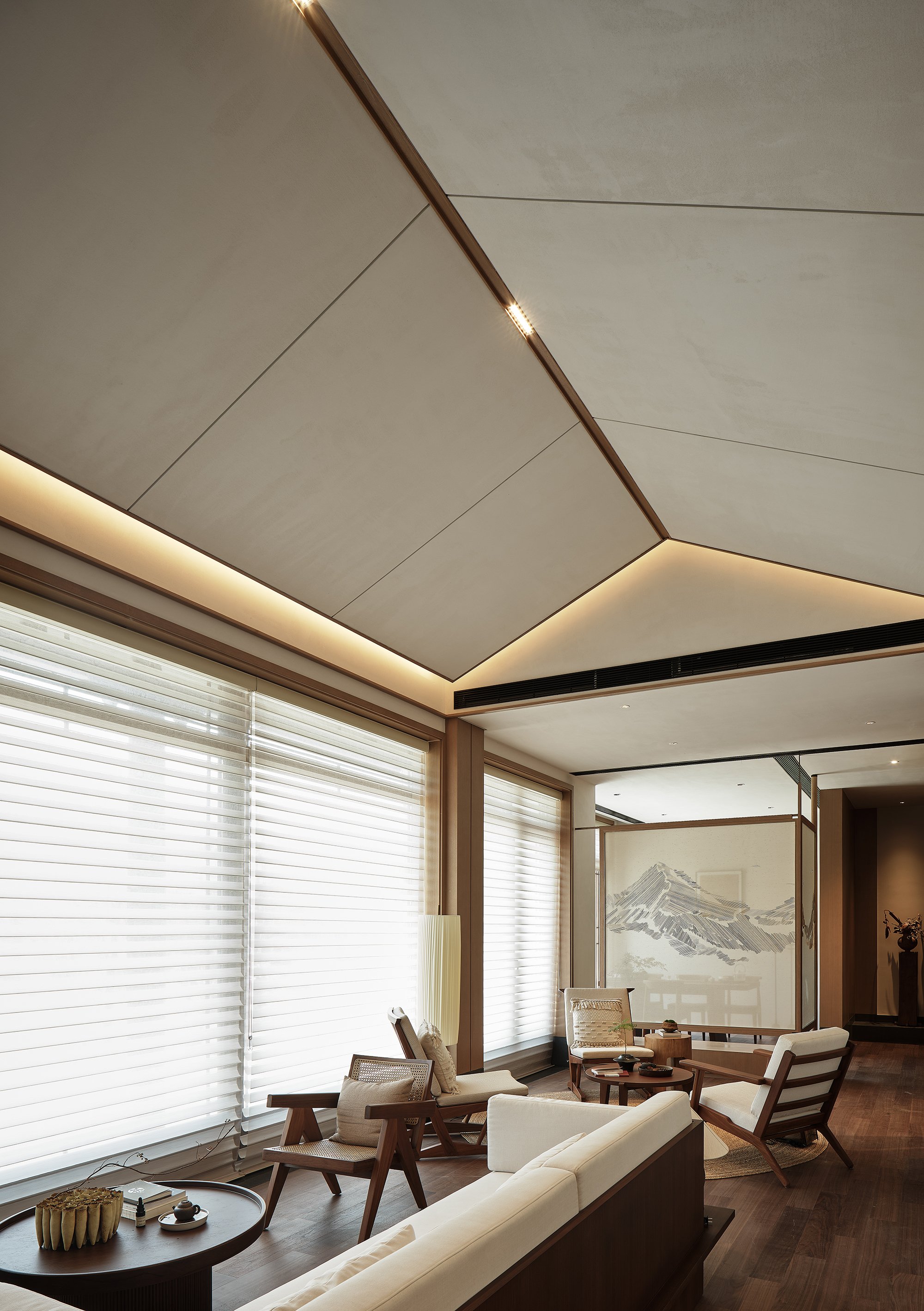 室內(nèi)吊頂以中式坡頂為原型進(jìn)行簡(jiǎn)化,呼應(yīng)禪意這一主題。不同于展示區(qū)對(duì)自然元素的對(duì)話和運(yùn)用,社交客廳的自然元素主要通過落地窗實(shí)現(xiàn)人與自然的視線交匯。
