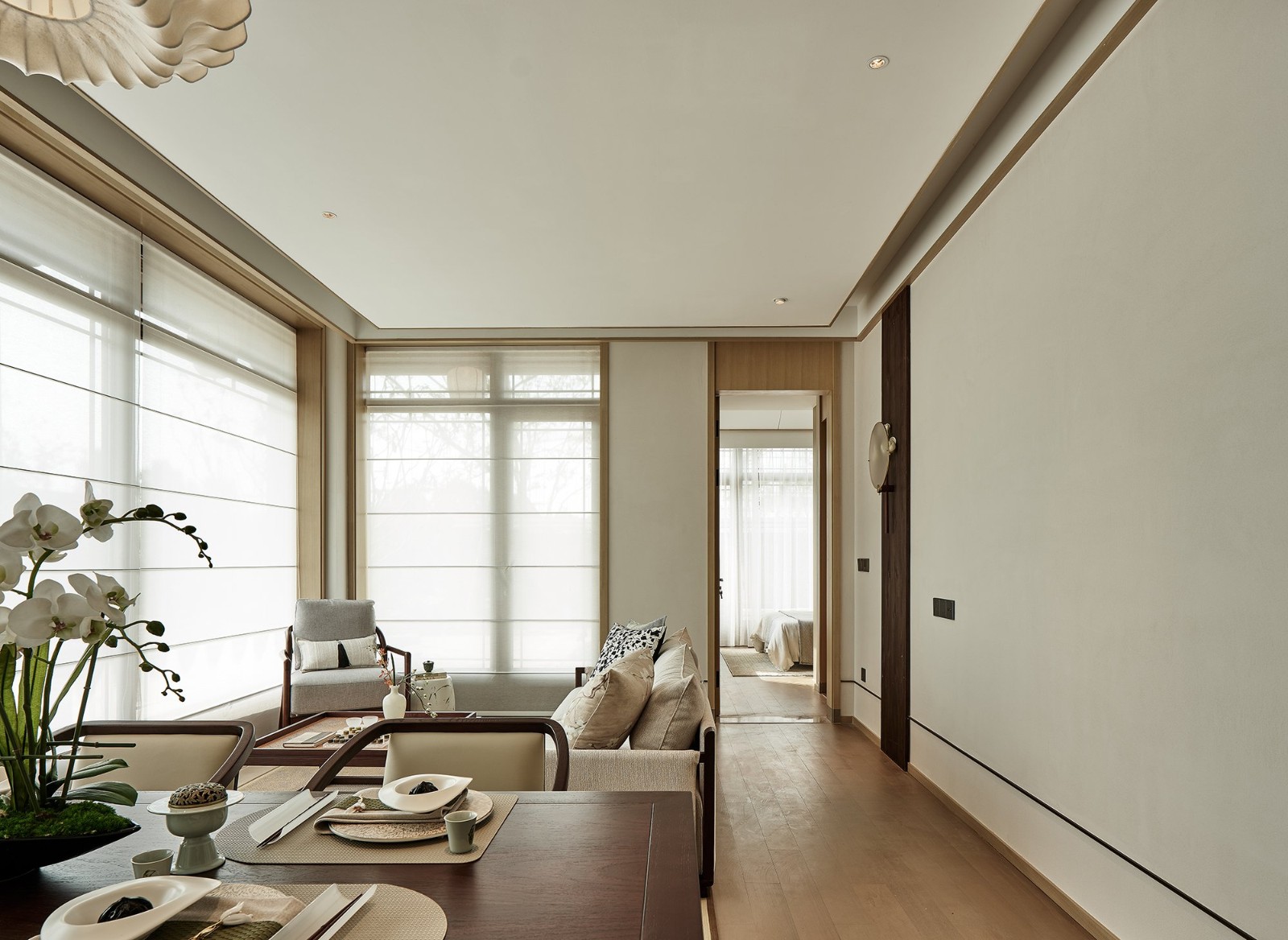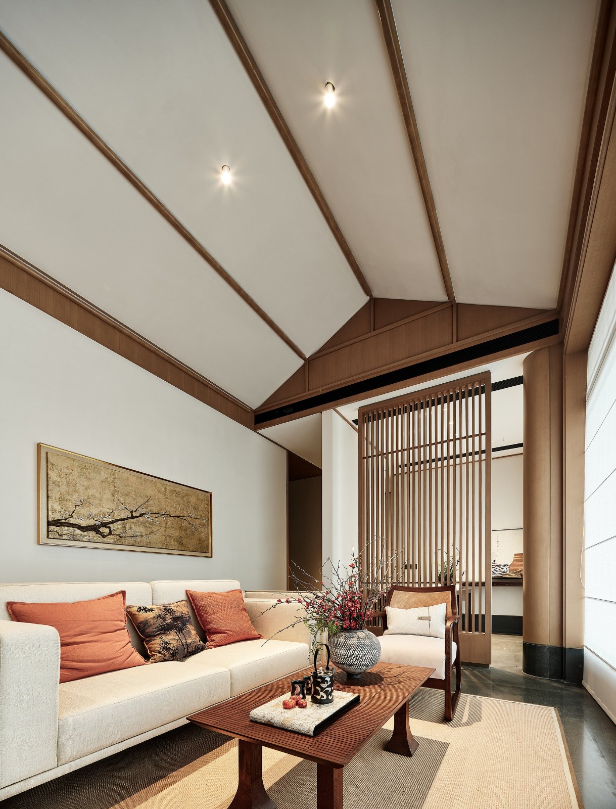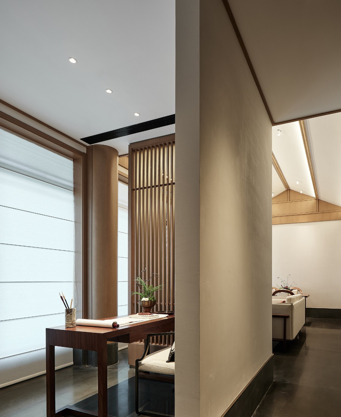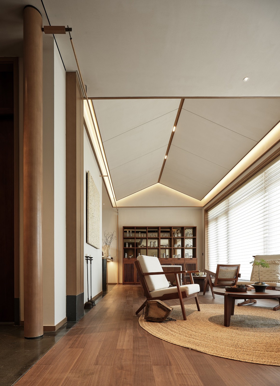 室內(nèi)吊頂以中式坡頂為原型進(jìn)行簡(jiǎn)化,呼應(yīng)禪意這一主題。不同于展示區(qū)對(duì)自然元素的對(duì)話和運(yùn)用,社交客廳的自然元素主要通過落地窗實(shí)現(xiàn)人與自然的視線交匯。