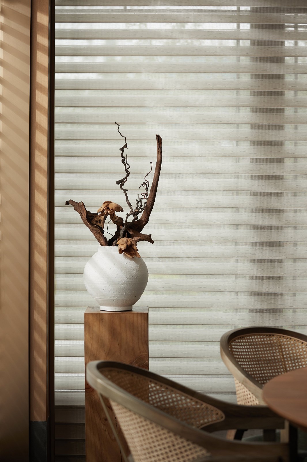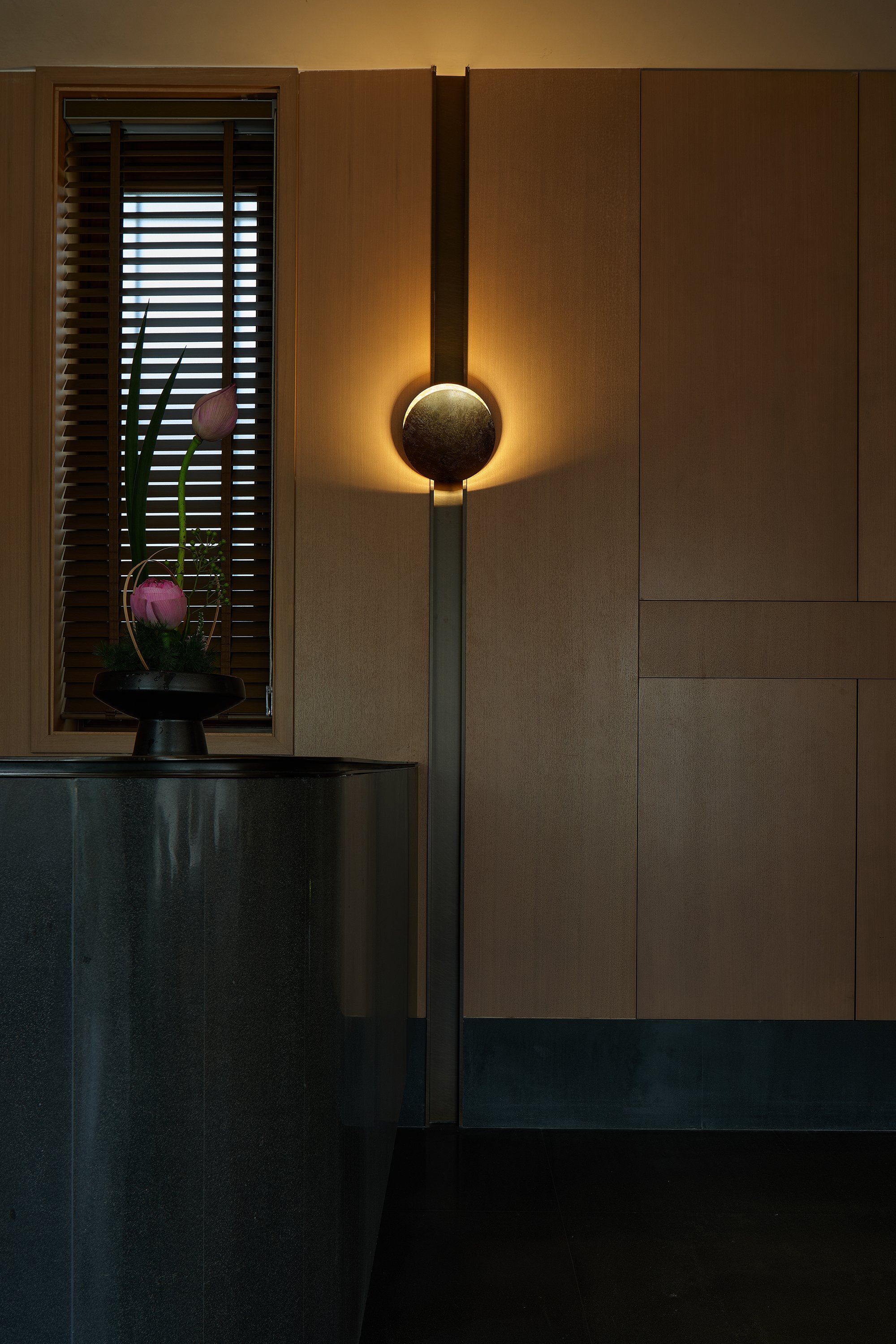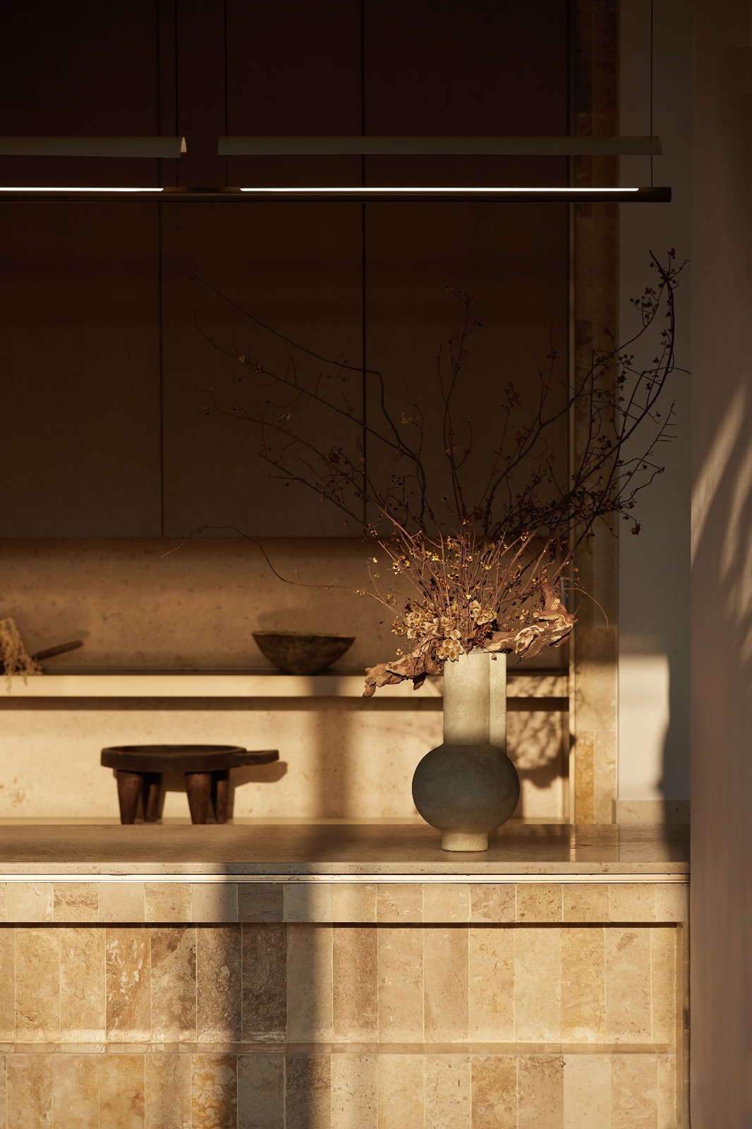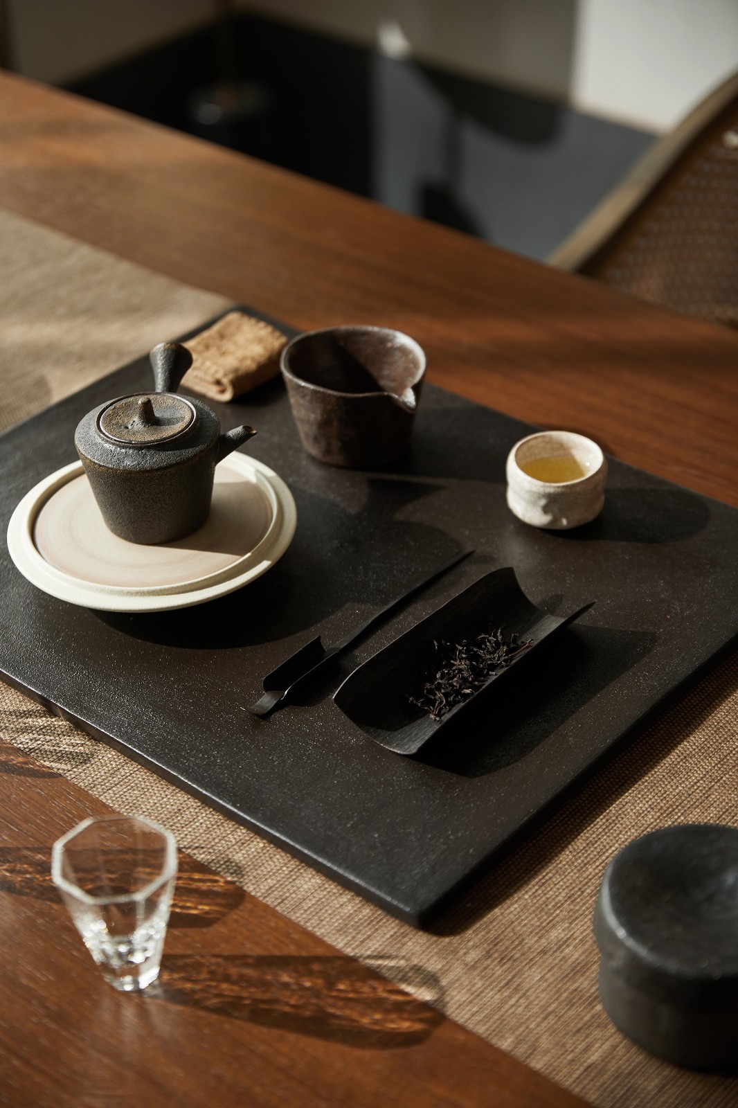 精致的器皿里蘊(yùn)含著使用者在生活中所追求的儀式感,在入口軟裝的選型上,融入了一些自然意向,結(jié)合矮凳和條桌的選型,放大了空間的禪意氛圍,并增加了人們?cè)诖颂幇l(fā)生交流的可能性。