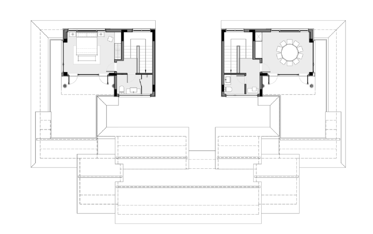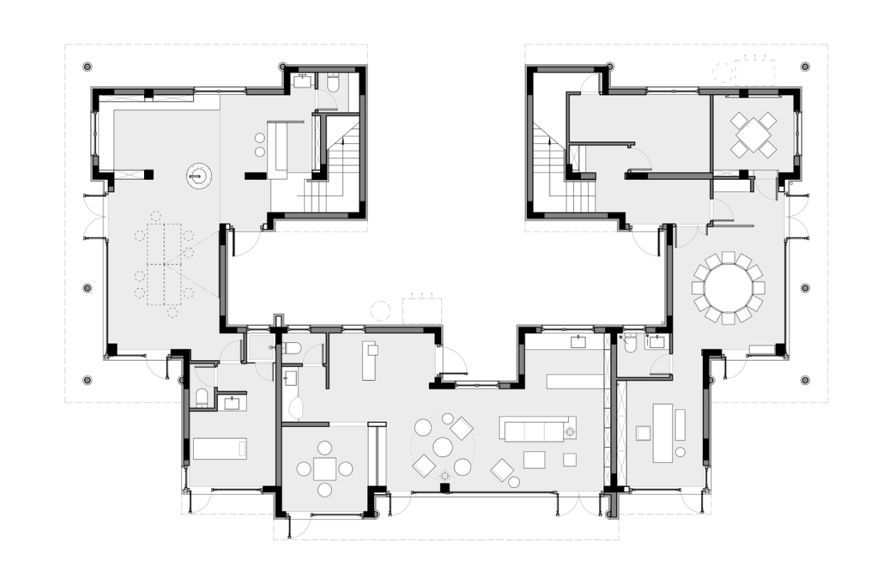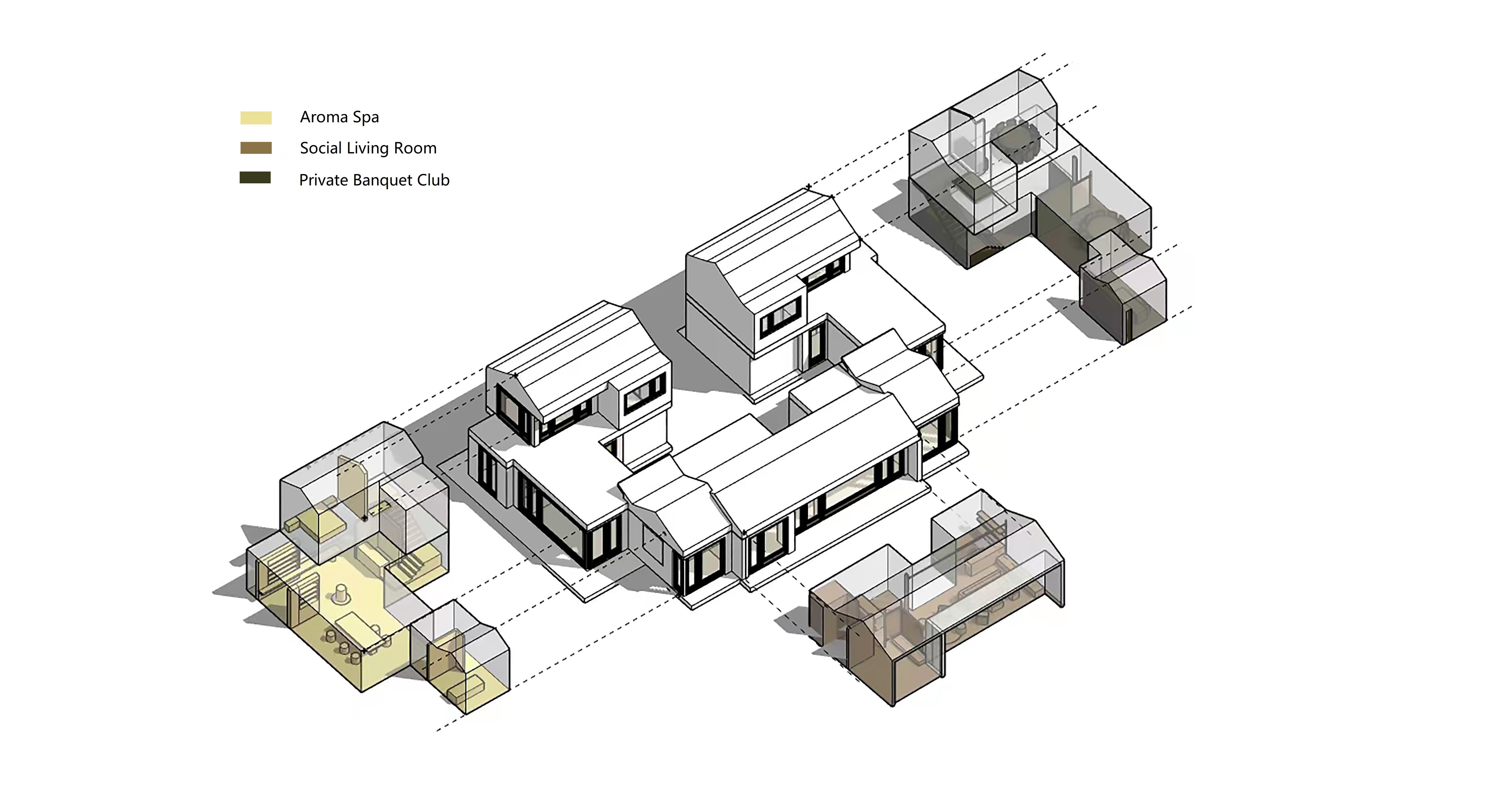 作為相對(duì)動(dòng)態(tài)的會(huì)所及小鎮(zhèn)的體驗(yàn)區(qū)域,設(shè)計(jì)者按照其空間需求功能,劃分為以“花”和體驗(yàn)為主的芳香區(qū)、以會(huì)談與社交為主的“茶”主題社交客廳、以及以“食”為主題的私宴會(huì)所。三個(gè)不同空間區(qū)域借由彼此互聯(lián)的動(dòng)線關(guān)系,被統(tǒng)一在同一系統(tǒng)內(nèi),并向各自的庭院延伸。