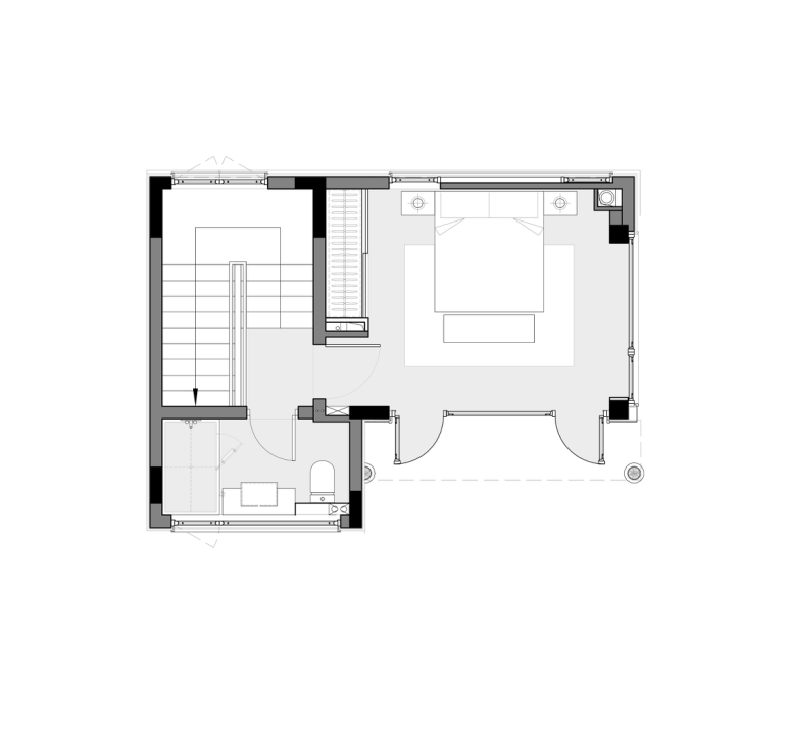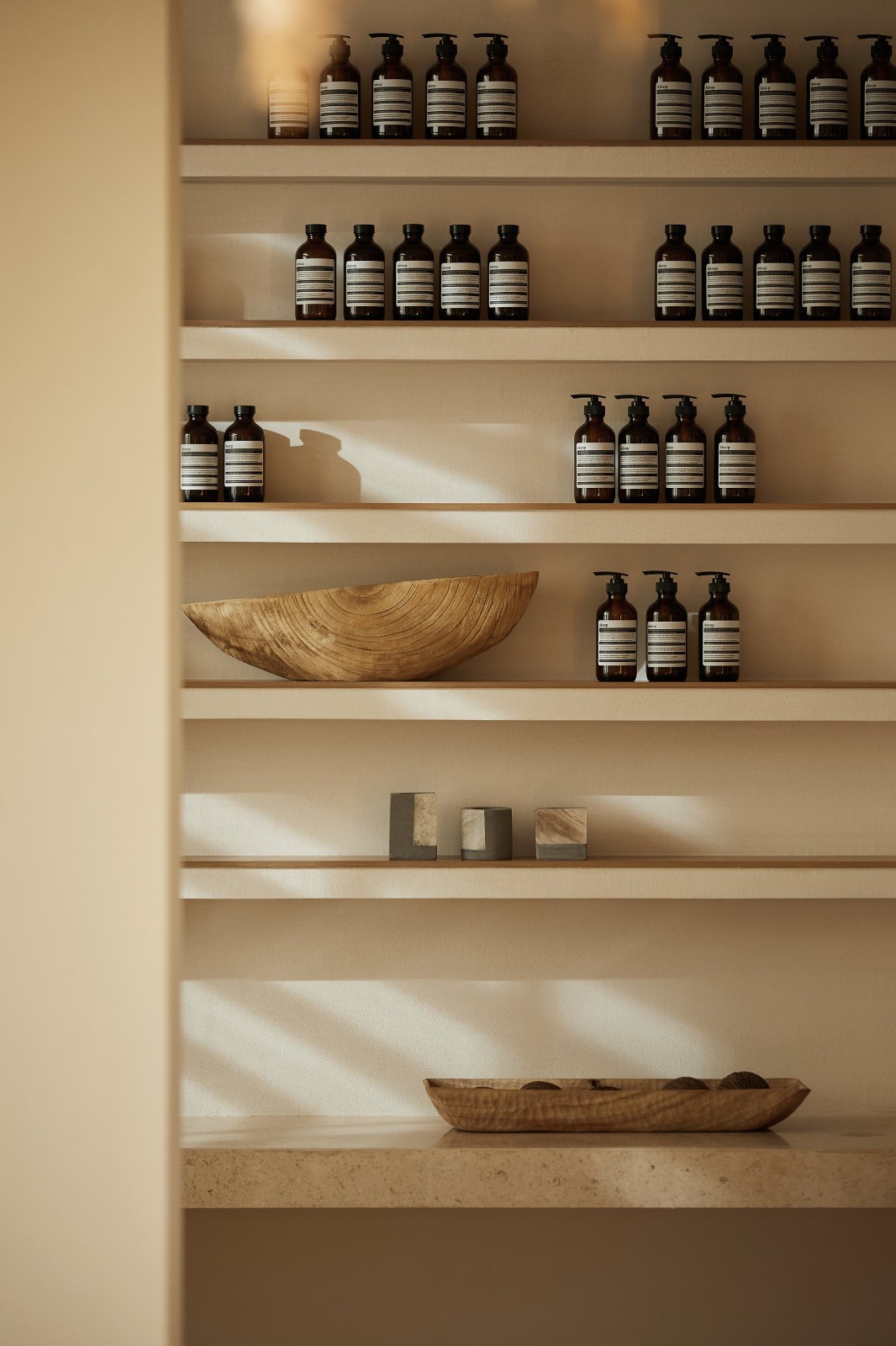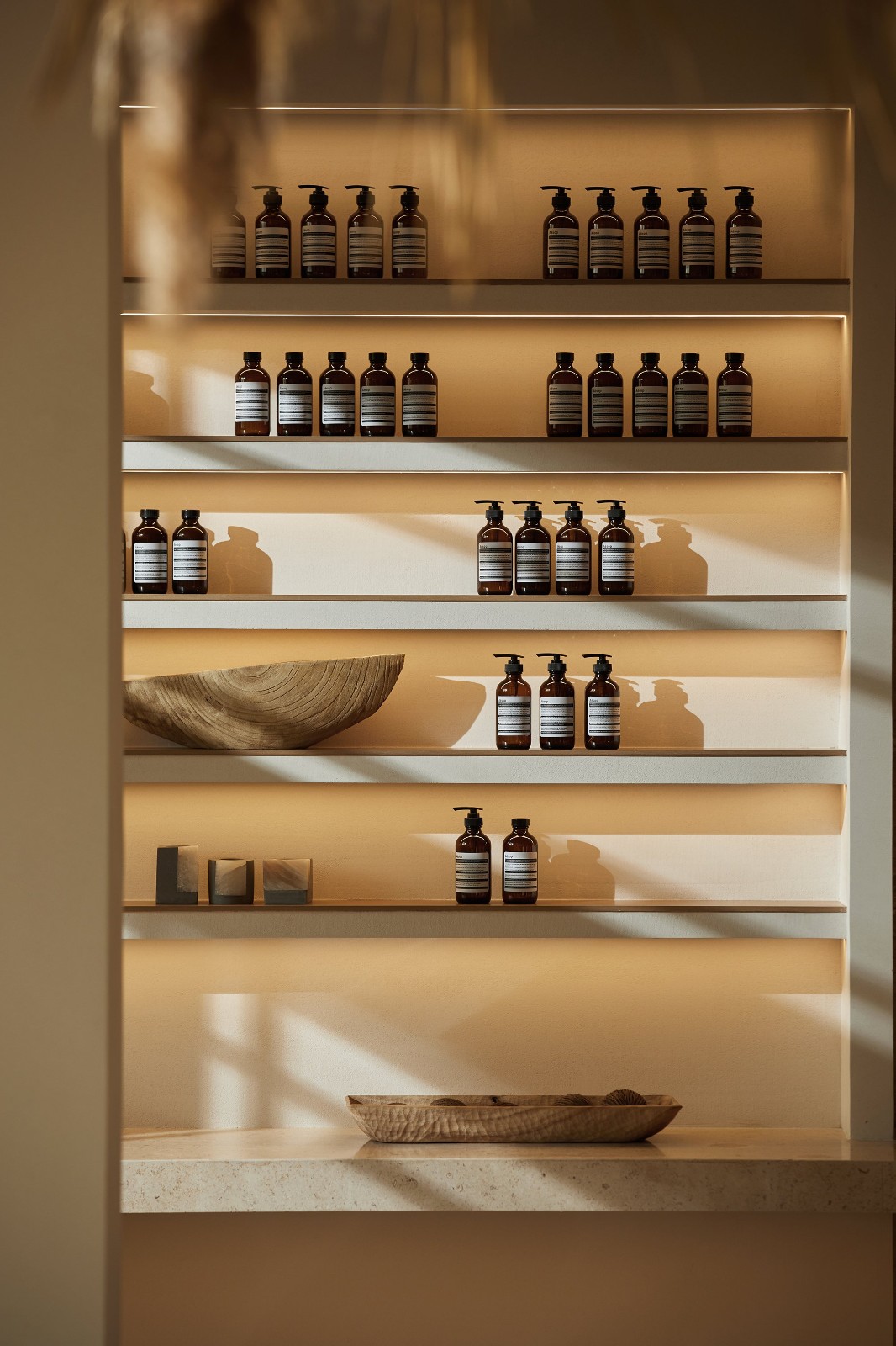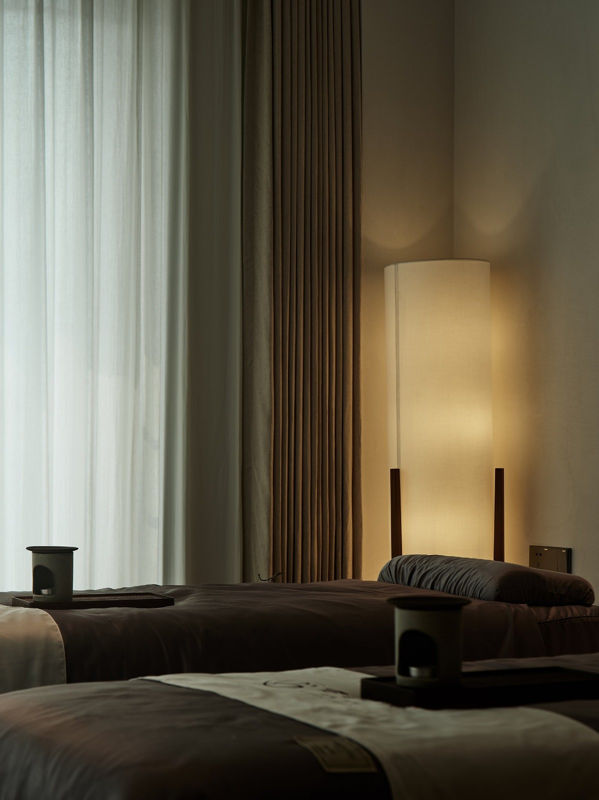 Spa區(qū)和客房采用顏色較深的顏色搭配和光影效果,為在此休息的客人提供一個(gè)舒適的養(yǎng)生場(chǎng)所。從芳香展示區(qū)整體來看,設(shè)計(jì)都嘗試向外界傳達(dá)一種避世、度假、花園、愜意的生活理念。