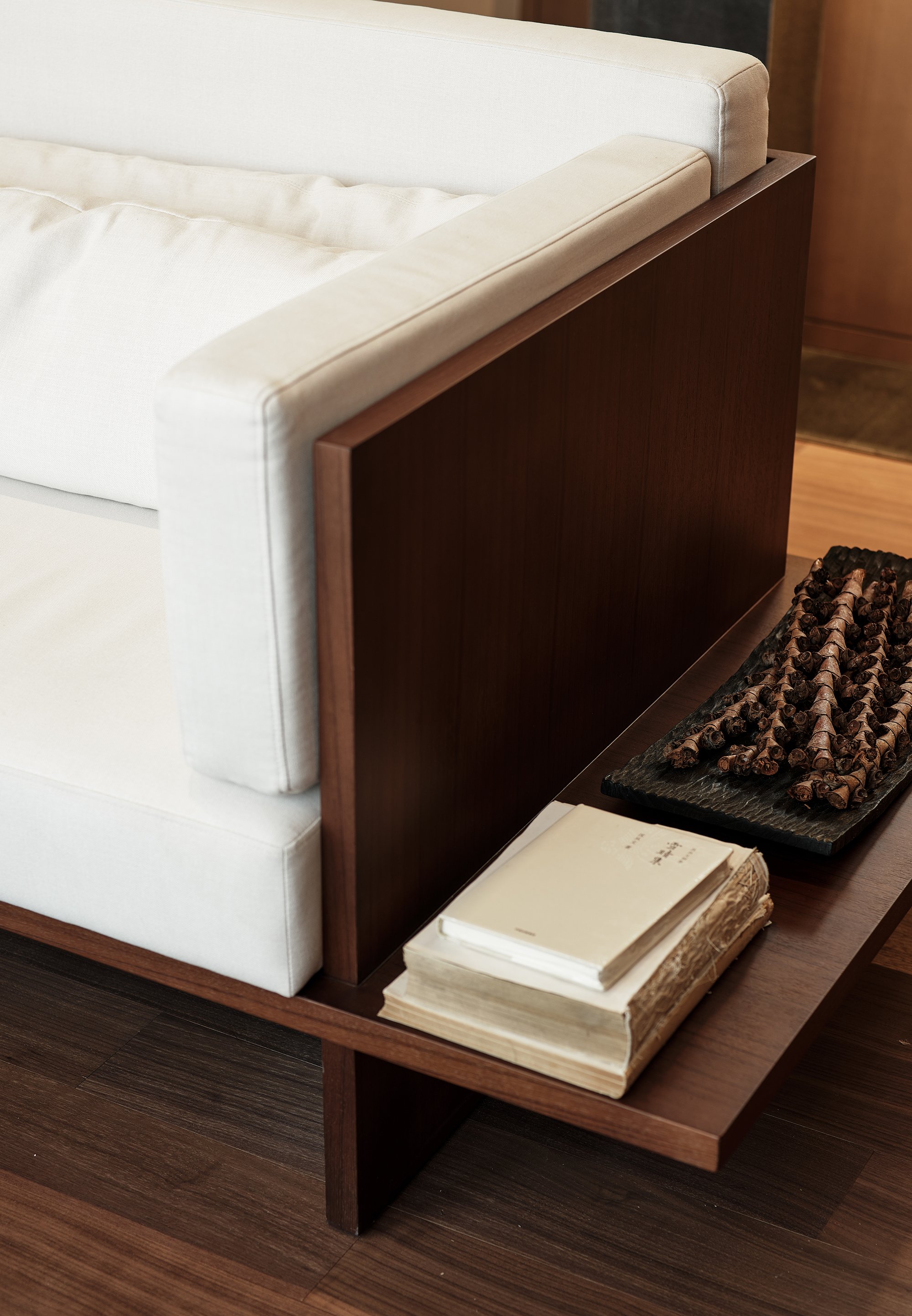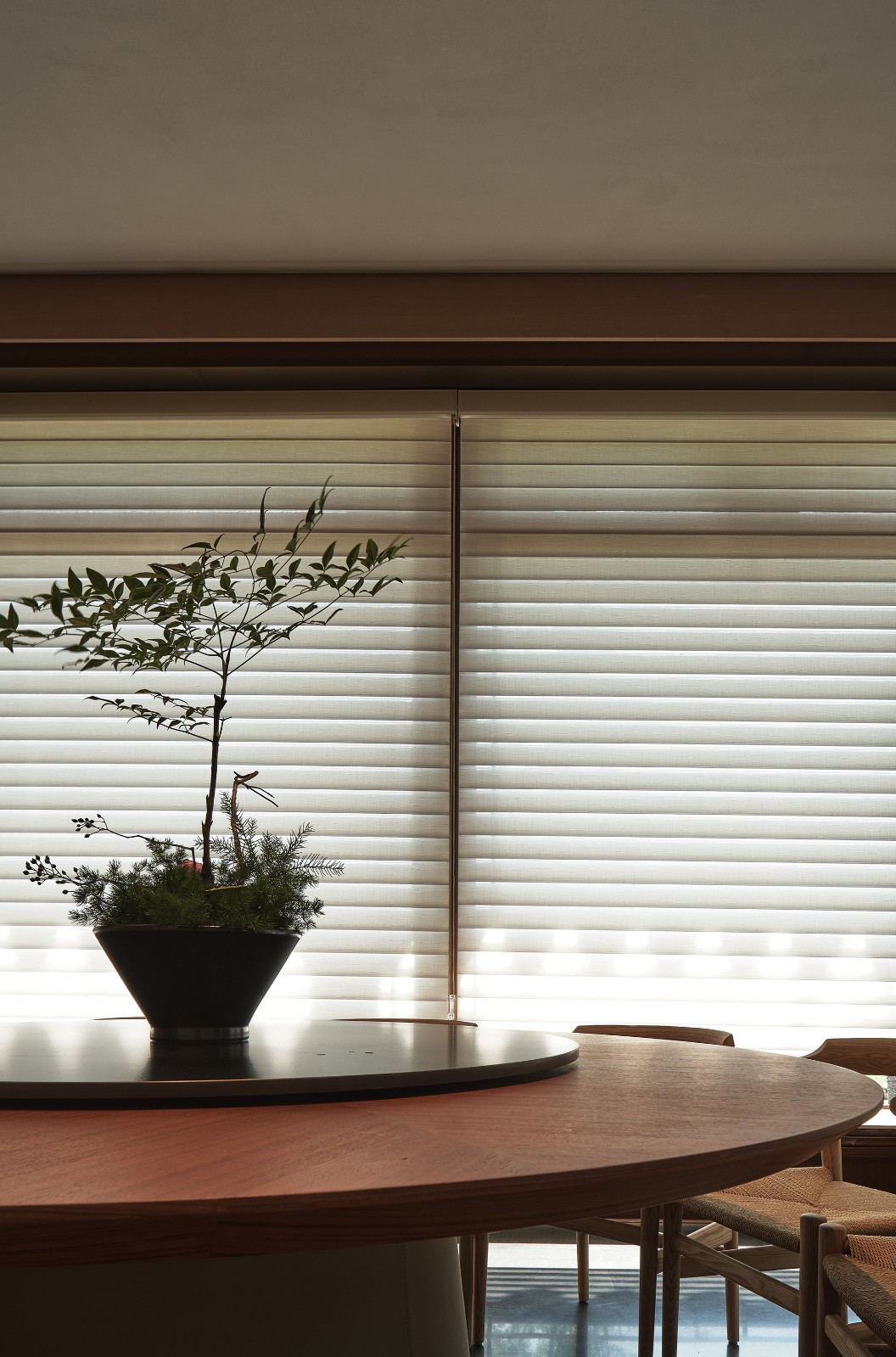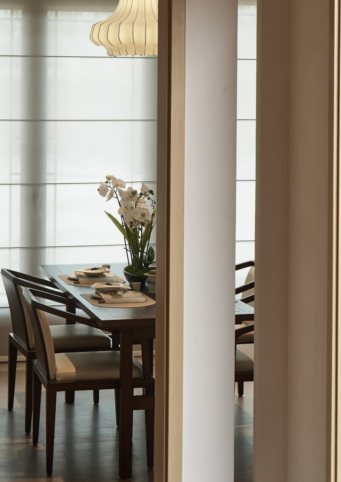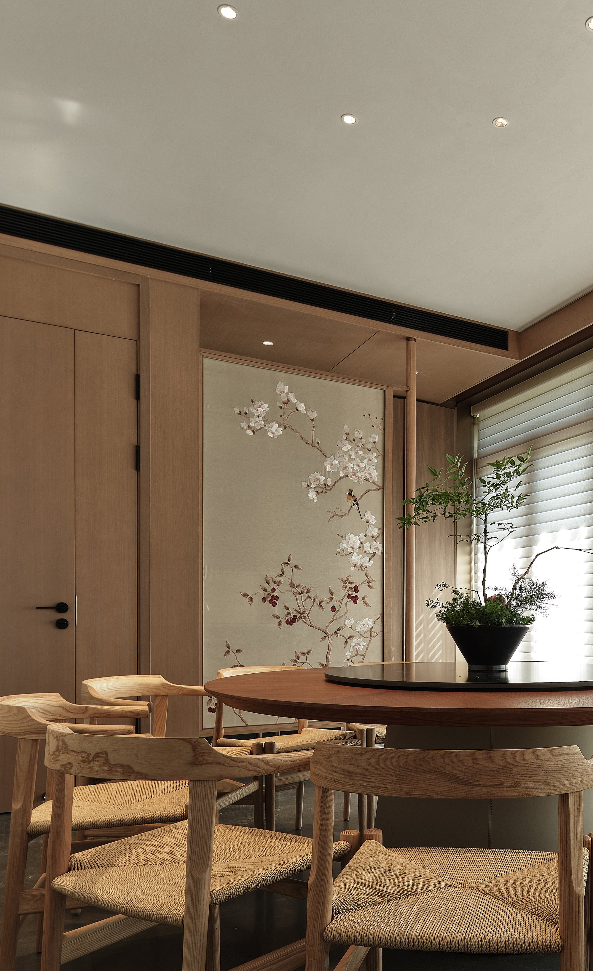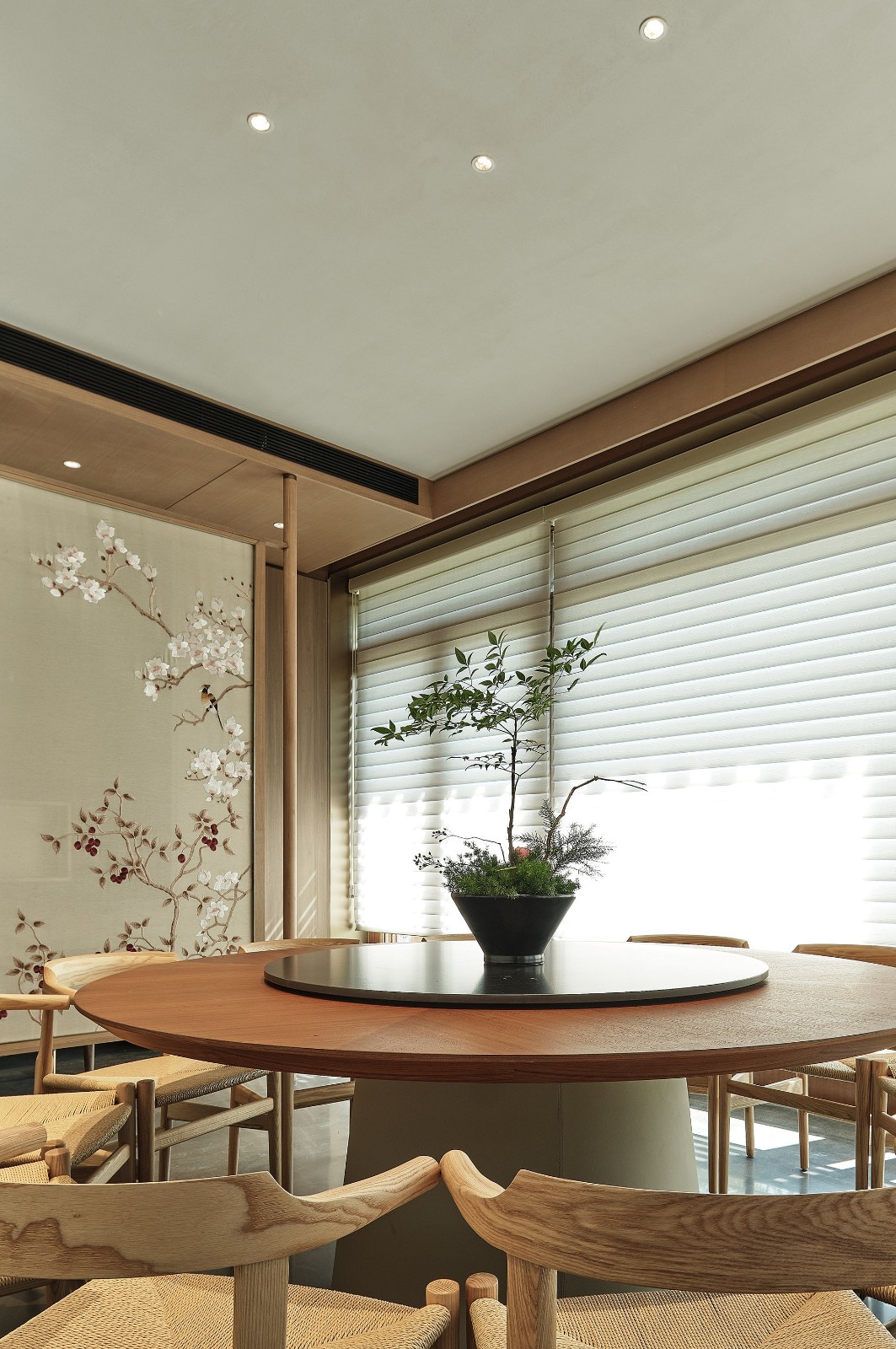 私宴會(huì)客延續(xù)了前者雅致的空間感受,且以深色系木質(zhì)為底,材質(zhì)間互相呼應(yīng),創(chuàng)造出自然親切,開敞靜謐的私密空間。