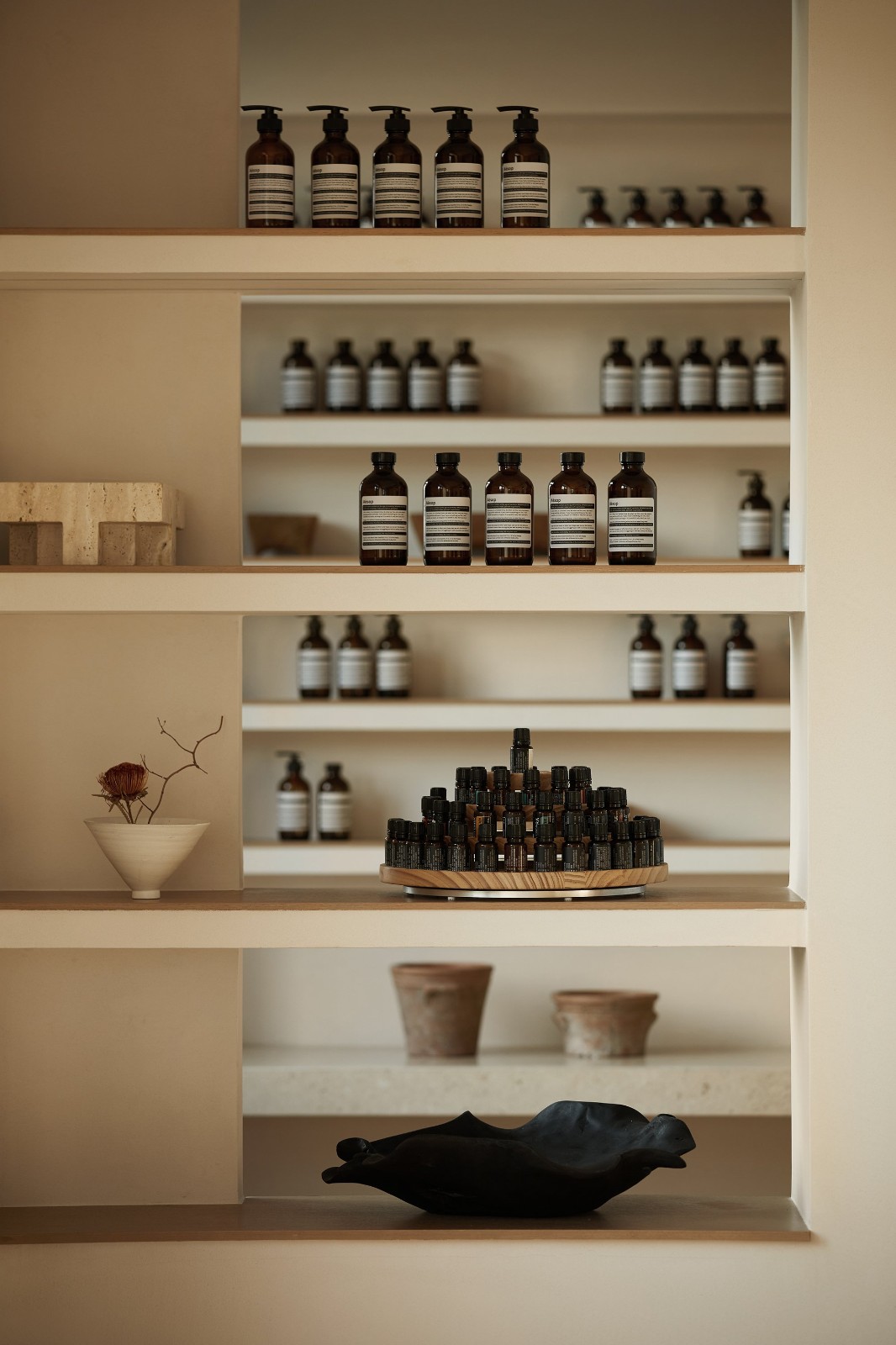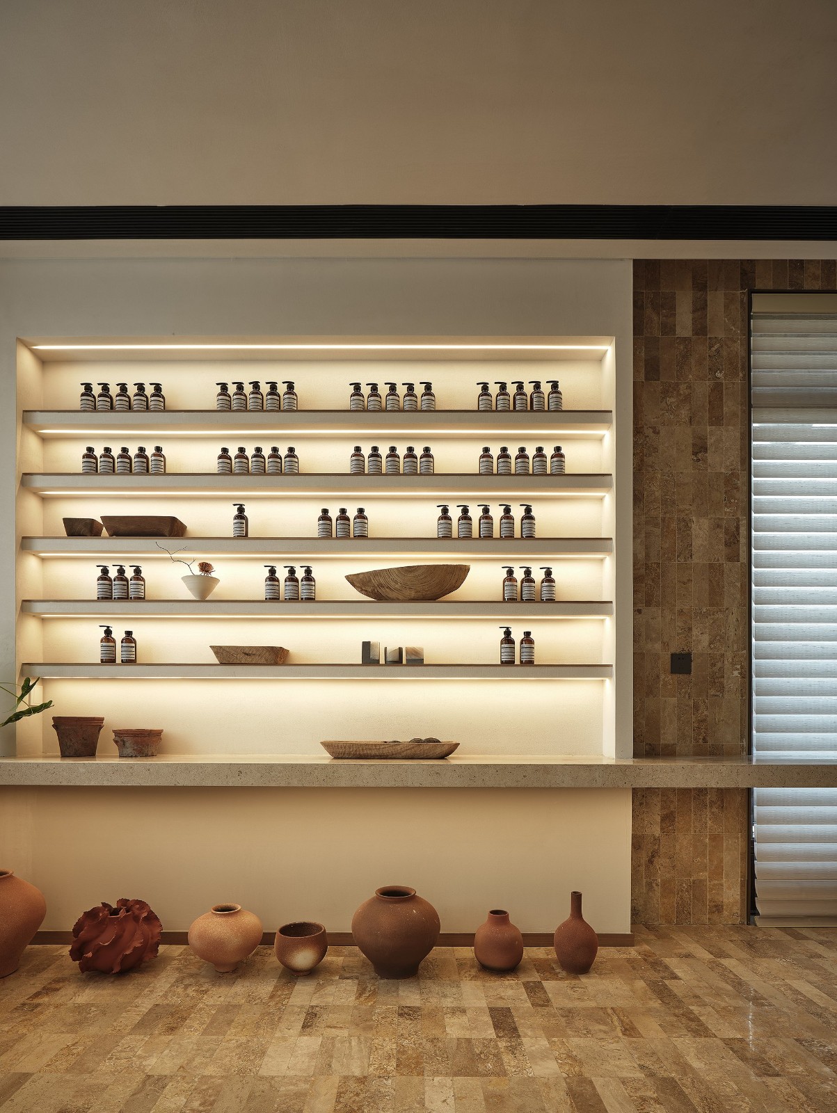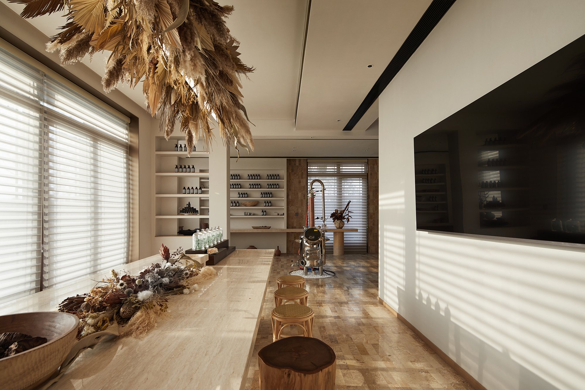 而芳香體驗(yàn)區(qū)域,增加了洞石的材質(zhì),與木質(zhì)的碰撞,為空間帶來一絲沉靜安逸的氛圍。