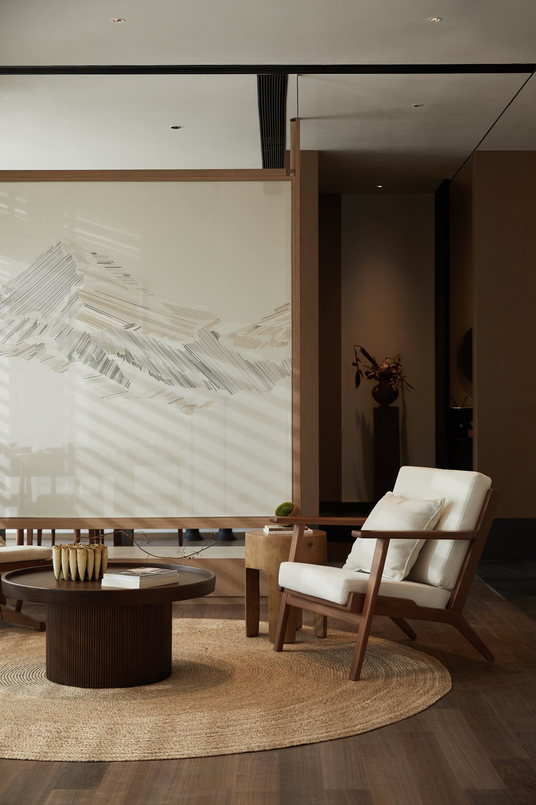 中國(guó)人講以茶會(huì)友,飲茶是傳統(tǒng)文人墨客交流和休憩時(shí)的主要活動(dòng)。作為休息、社交、過渡的空間,社交客廳區(qū)域以中式禪意的工筆畫為初始意向,整體設(shè)計(jì)風(fēng)格典雅幽靜,實(shí)現(xiàn)意識(shí)精神層面的閑適與安逸。