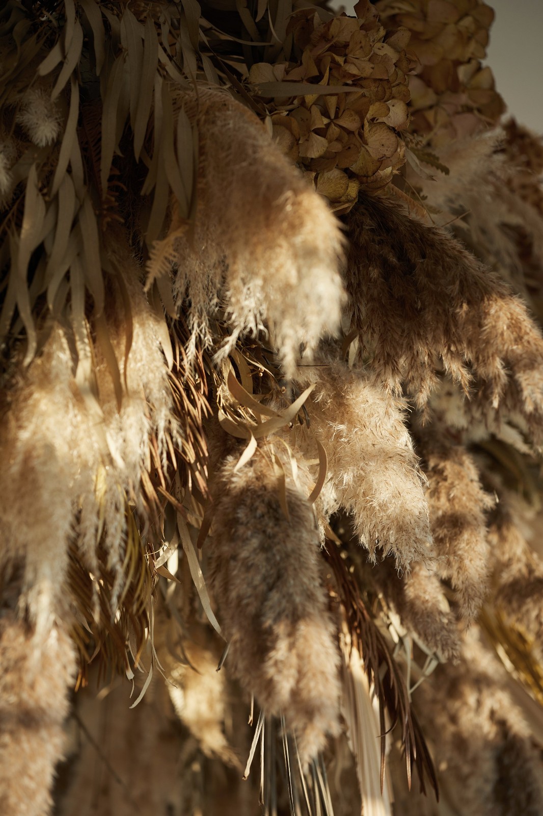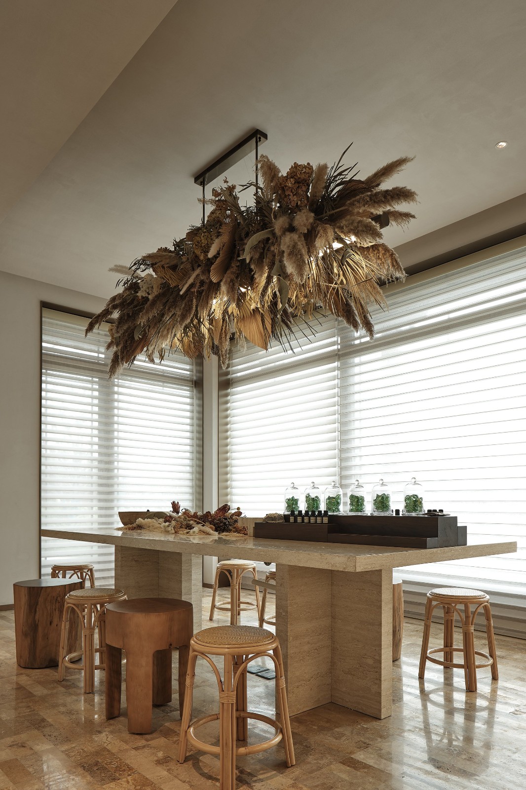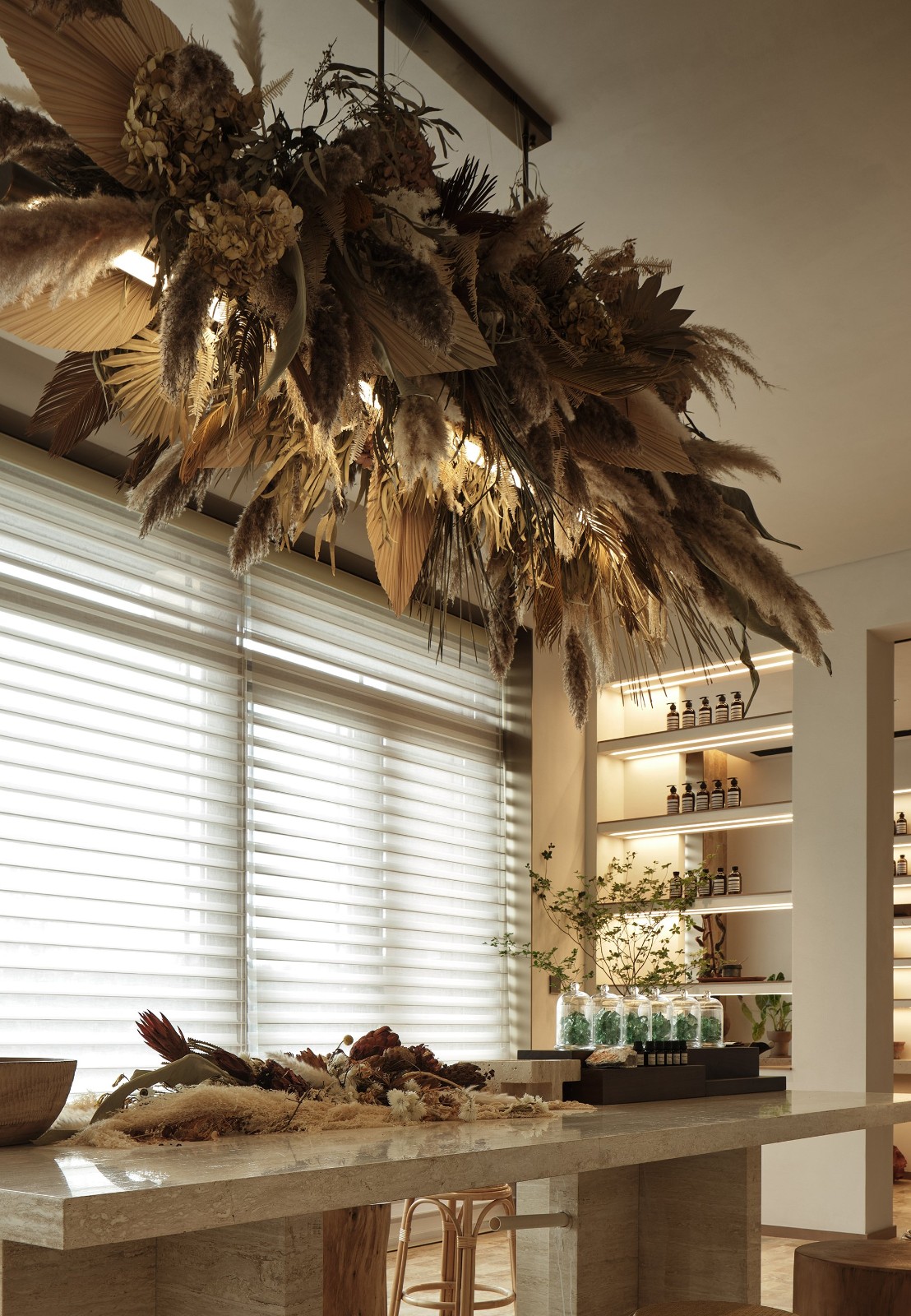 多種木質(zhì)的混合,結(jié)合在室內(nèi)裝置上添加的頂棚吊花,也強(qiáng)調(diào)了整體空間的草木質(zhì)感。家具選型又以手工藝術(shù)風(fēng)格制品為主,強(qiáng)化了這種的氛圍感受。