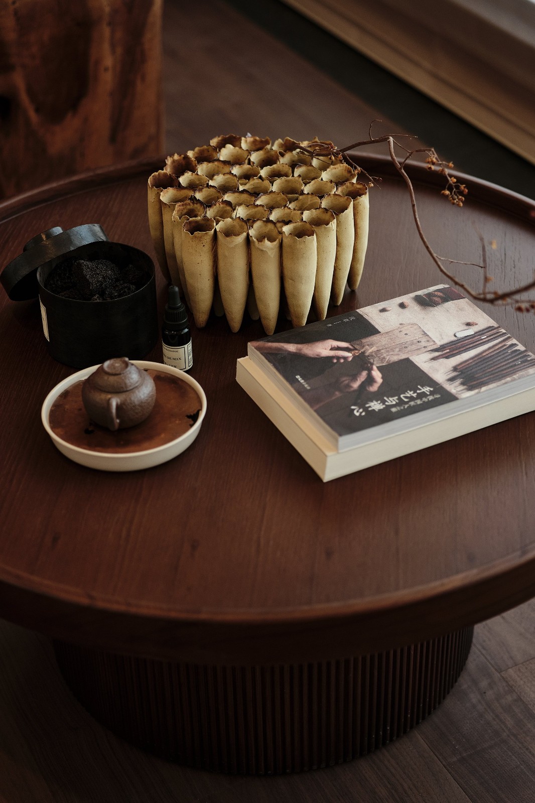 木質(zhì)顏色與玻璃,及制香機(jī)器金屬質(zhì)感的混合搭配,使空間多了一重人與自然相融合的氛圍。