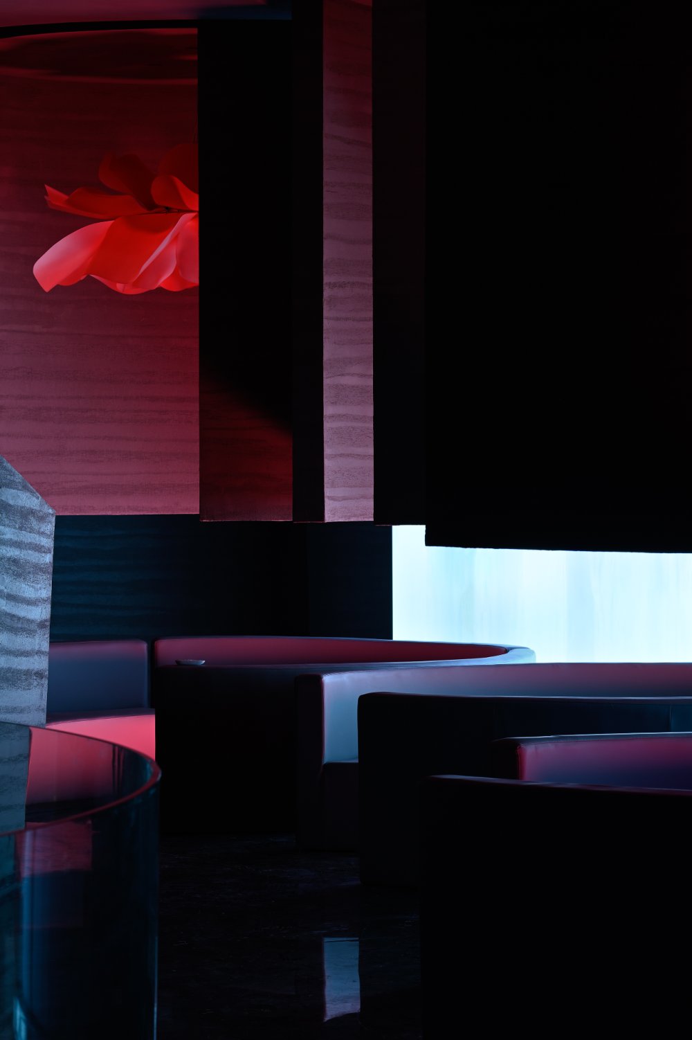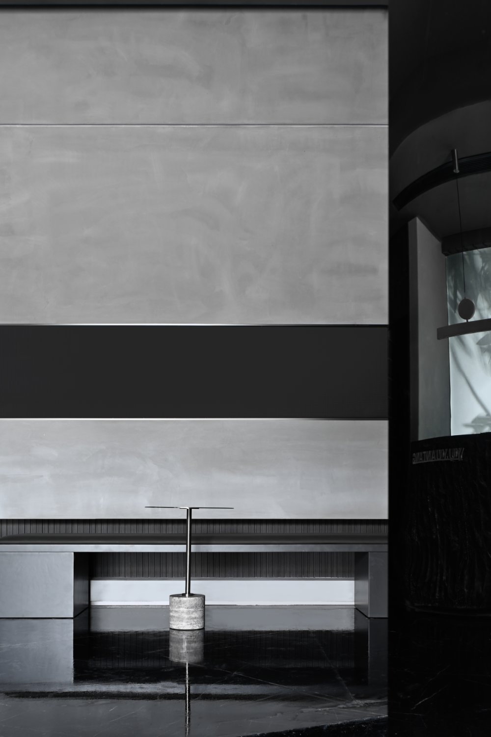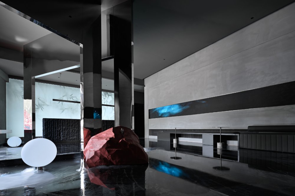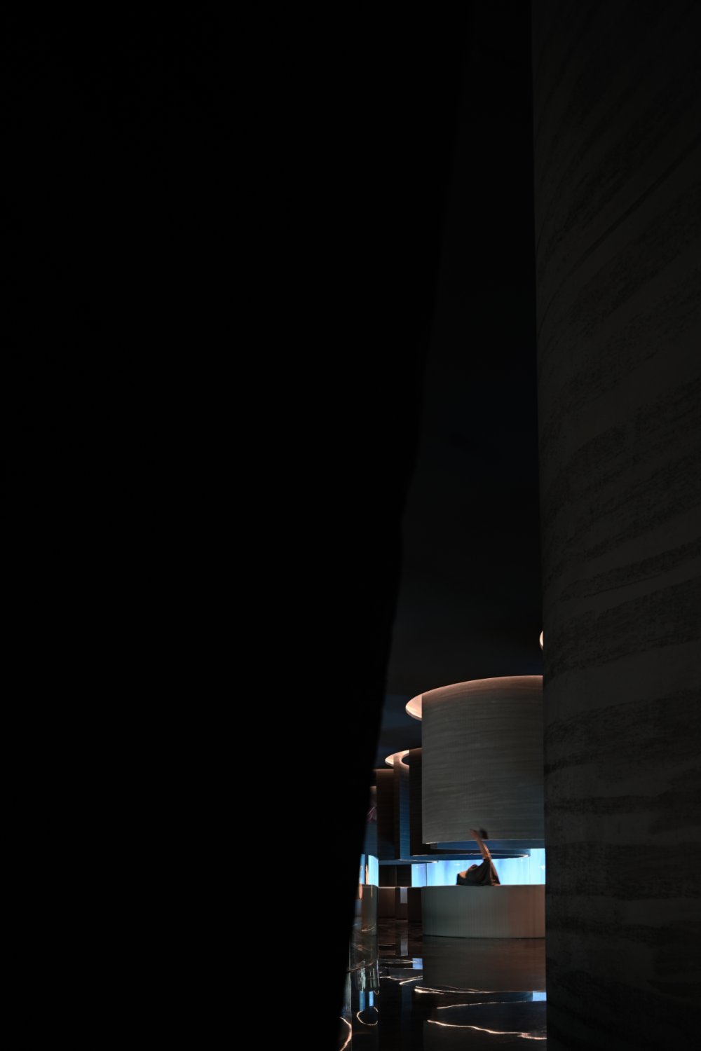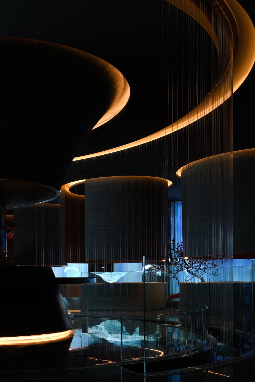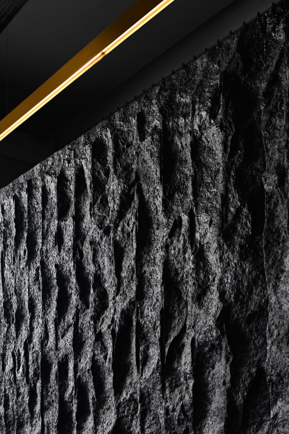 - 山與水的結(jié)合,是江南小景的象征。錯落有致的線條盤踞在整個空間之上,搭配著暖黃的燈光,“野蠻”地從空間生長開來。在整體的幽暗環(huán)境的襯托下,一絲微光點綴,讓光與“影”曖昧互融。