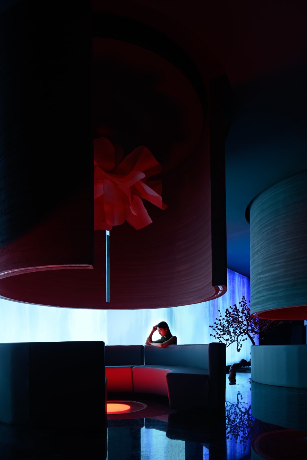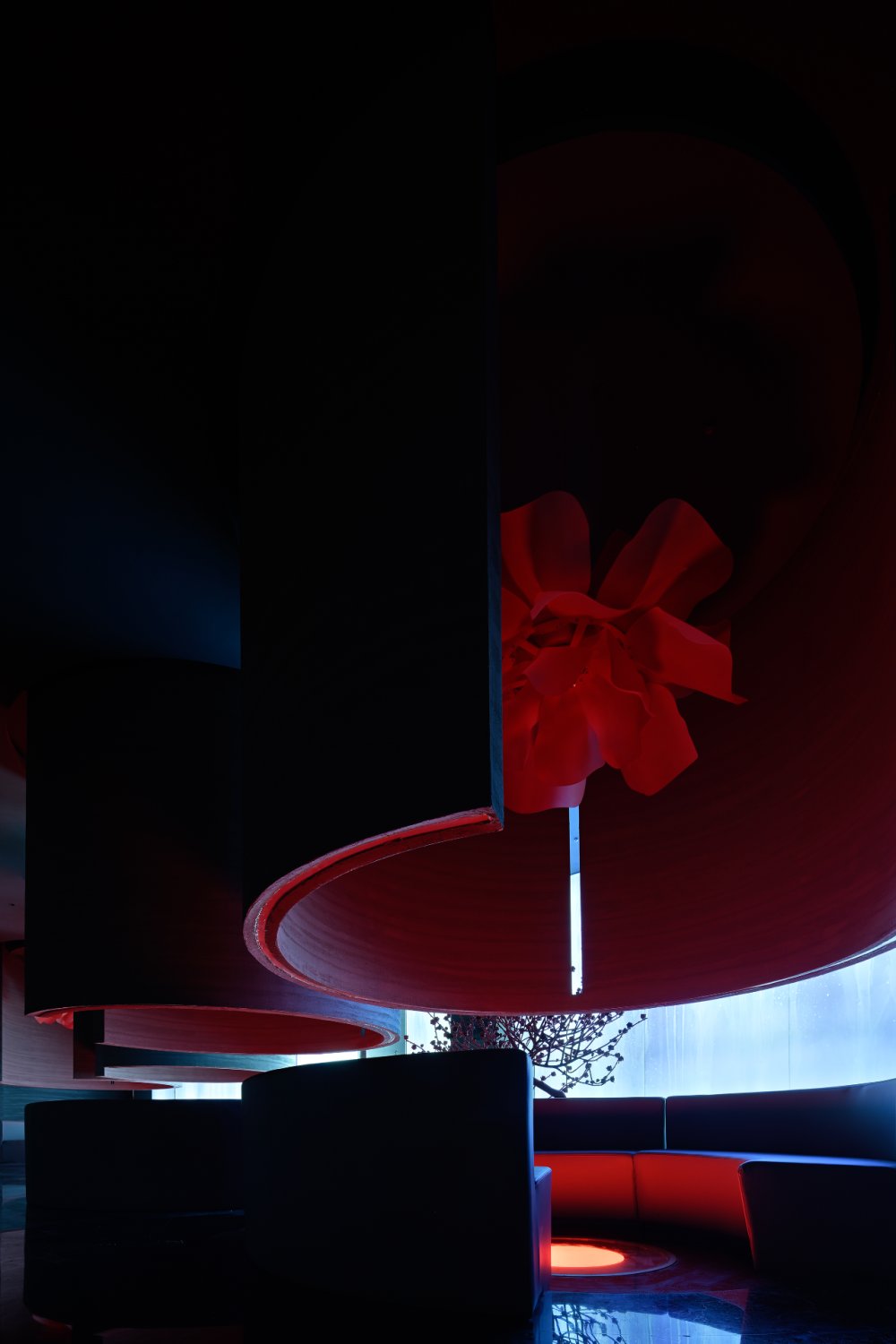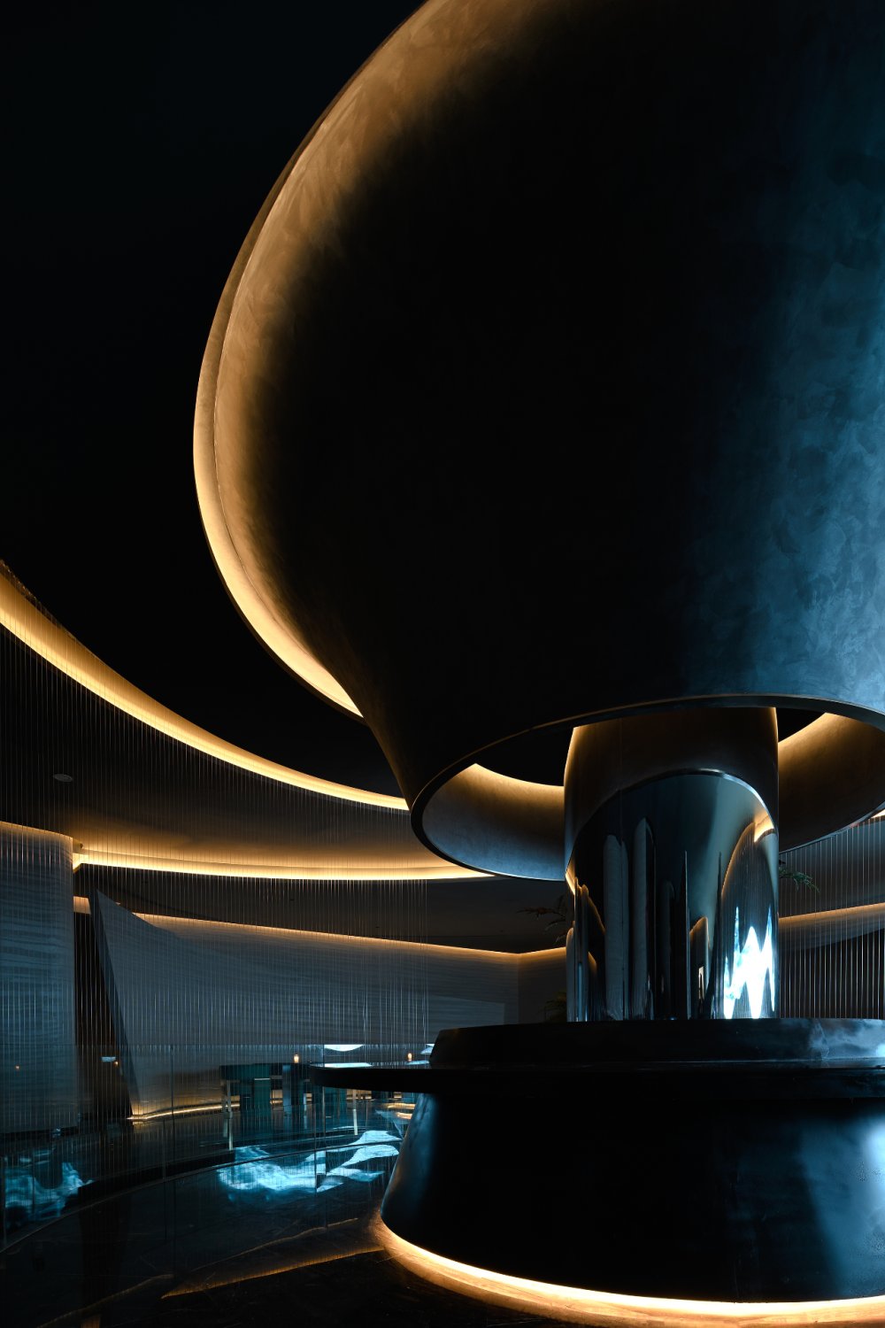 - 接天水碧,山巒環(huán)繞;巨型的花燈搖曳欲墜。墻,連接著頂和地,破開了整體,同時也起到了一定的隱秘性。流動的曲線與空間相得映彰,宛如一個姿柔體態(tài)的江南女子。