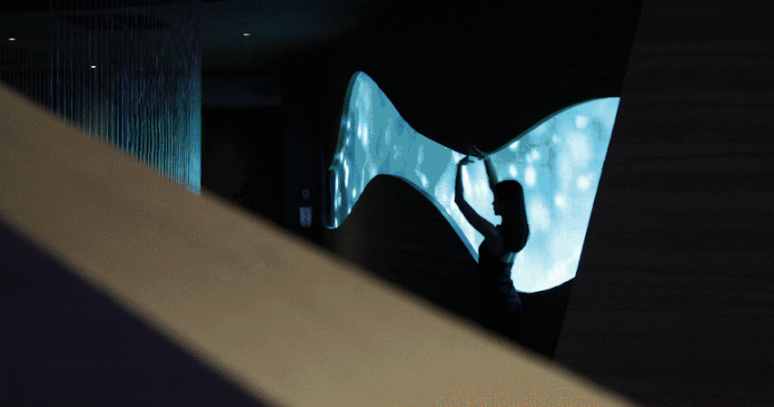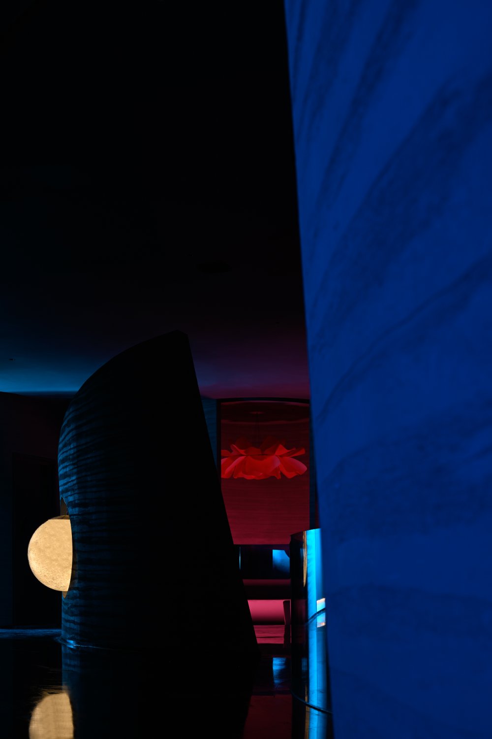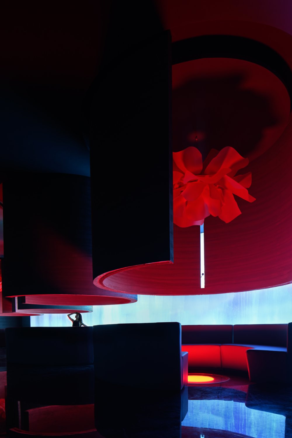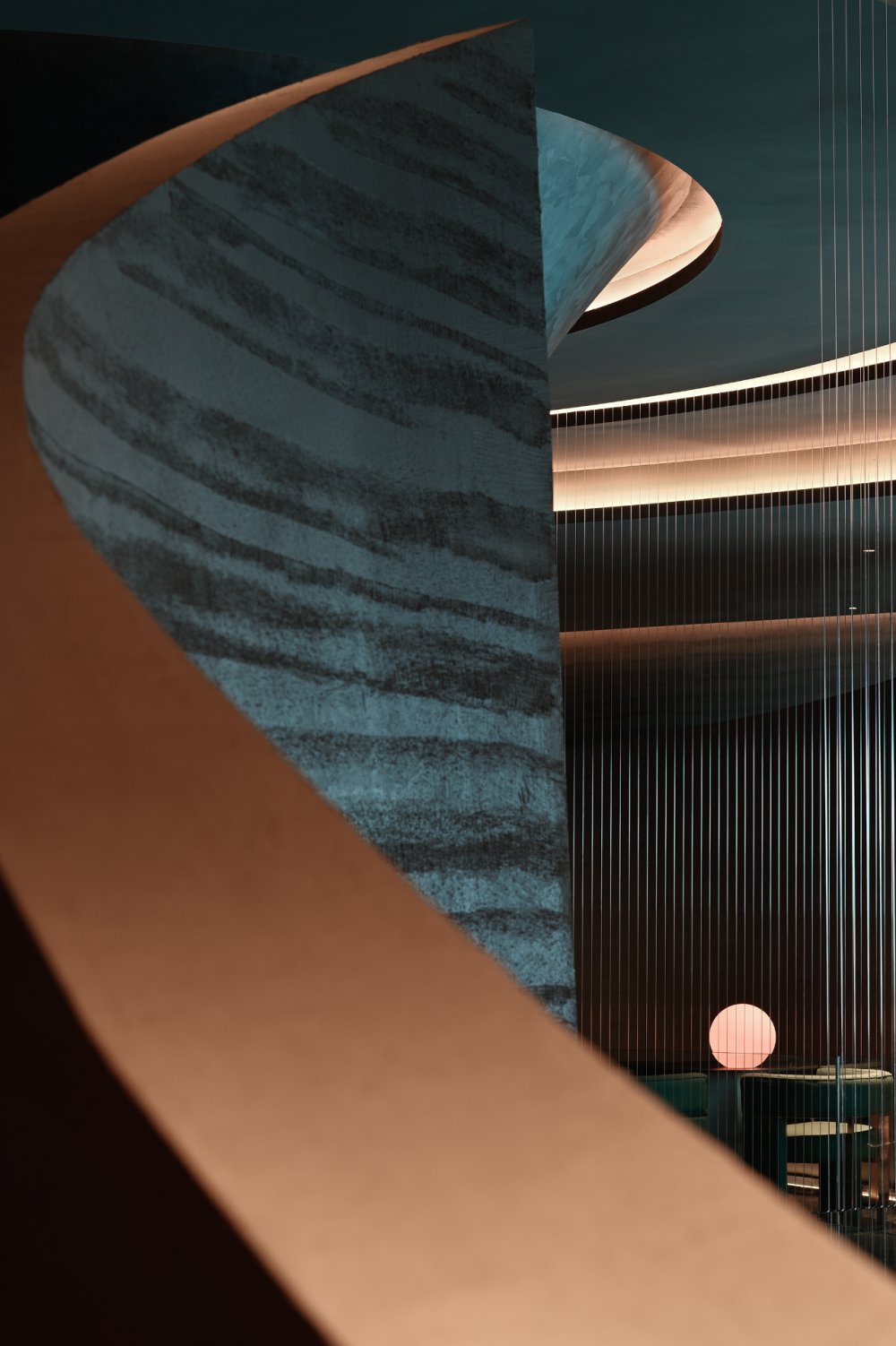 - 接天水碧,山巒環(huán)繞;巨型的花燈搖曳欲墜。墻,連接著頂和地,破開了整體,同時也起到了一定的隱秘性。流動的曲線與空間相得映彰,宛如一個姿柔體態(tài)的江南女子。