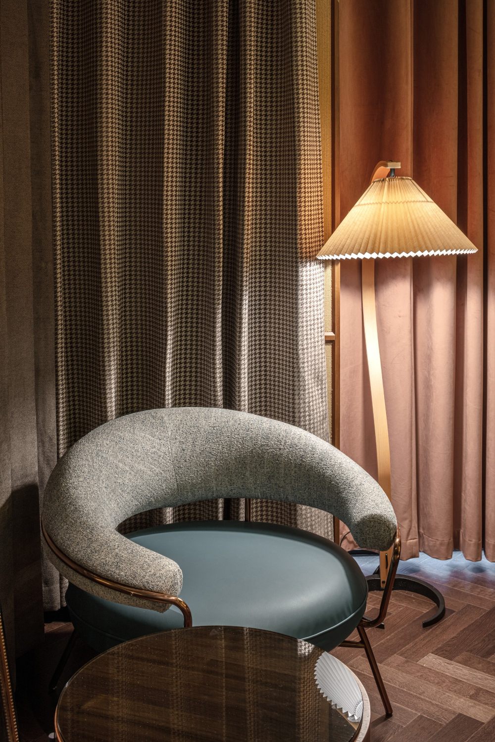 空間中的護(hù)墻板與拼花木地板體現(xiàn)出了經(jīng)典的裝飾韻味,但墻面簡(jiǎn)約的造型線(xiàn)以現(xiàn)代化的手法加入了時(shí)尚屬性,二者的結(jié)合,帶來(lái)微醺的復(fù)古風(fēng)情。